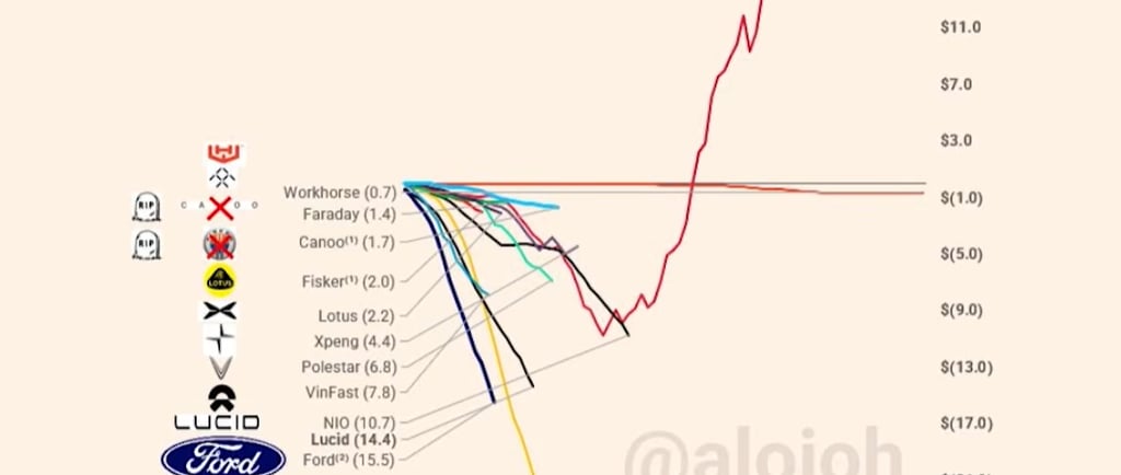 Na wykresie Tesla rysuje klasyczną czerwoną krzywą hokejowego kija: lata strat, a potem eksplozja w górę, energia i inne segmenty dołożyły też swoje. Pozostałe marki – Lucid (–14,4 mld), NIO (–10,7 mld), Xpeng, Polestar, VinFast, Canoo, Fisker (bankructwo) – wszystkie głęboko na minusie. Ford (jako proxy dla segmentu EV) też –15,5 mld.