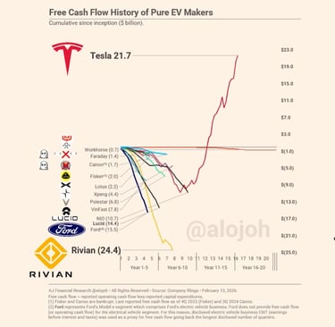 13 lutego 2026. Na X krąży właśnie wykres, który w brutalny sposób pokazuje skalę różnic w branży czysto elektrycznych samochodów. Autor – AJ Financial Research (@alojoh) – zestawił kumulacyjny free cash flow (wolne przepływy pieniężne) od momentu założenia firm aż do początku 2026 roku(skupiamy się wyłącznie na markach ev).