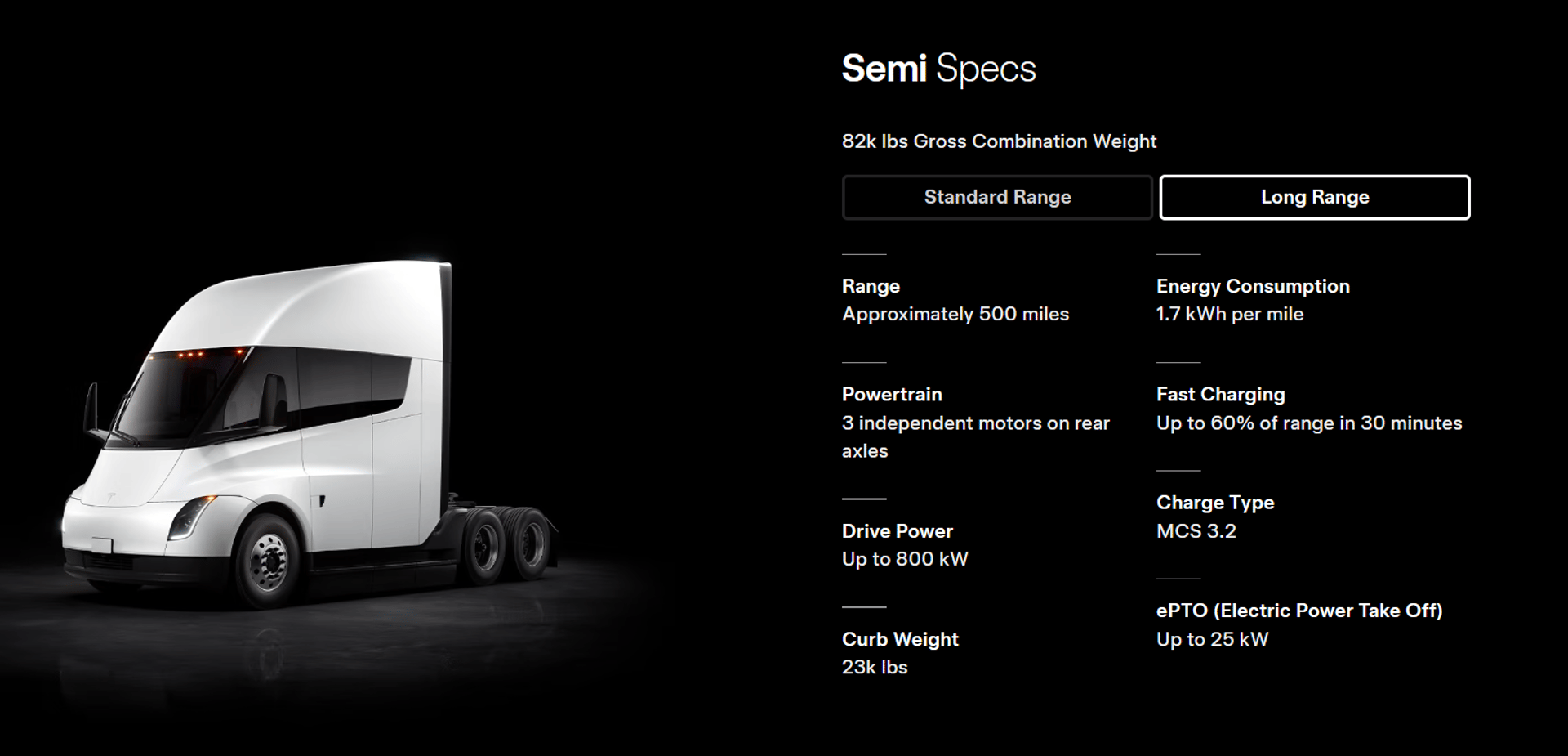 Semi korzysta ze standardu MCS 3.2 (Megawatt Charging System). Wersja Long Range osiąga szczytową moc ładowania 1,2 MW (1200 kW). W 30 minut można doładować do 60% pojemności baterii, co daje około 300 mil (ok. 480 km) dodatkowego zasięgu.